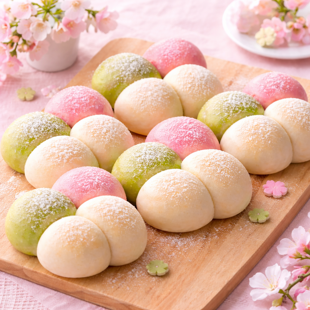 紫芋パウダーと抹茶パウダーを使って生地をやさしく色付けし、ピンク・緑・白の三色のあんパンを並べてつなげた、見た目も可愛い「三色団子風ちぎりあんパン」を作ります。
